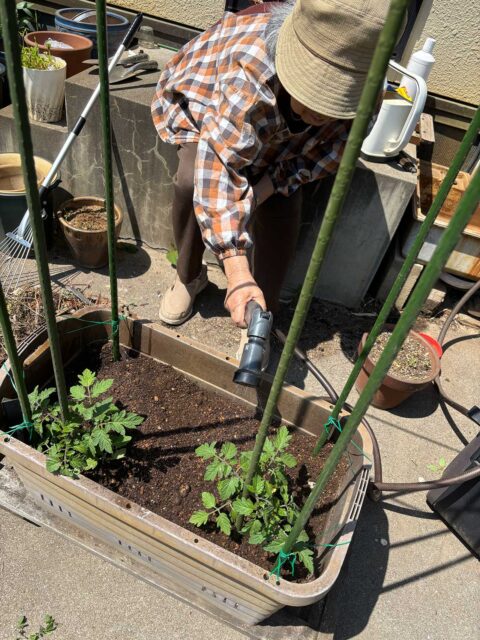 良い感じに黒土になってましたが、やや重たい感じがあったので、少し赤玉土をブレンドして、元肥を入れて支柱をセット。植え付けは母の出番。